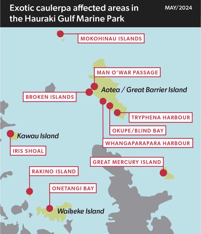 Exotic caulerpa has recently been found at two new locations: Rakino Island and the Mokohinau Islands.
