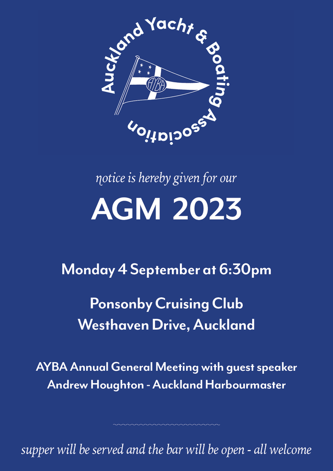 Auckland Yacht & Boating Association AGM 2023. Held on Monday 4th September 2023 at 6:30pm at Ponsonby Cruising Club. Supper will be served and the bar will be open. All welcome.