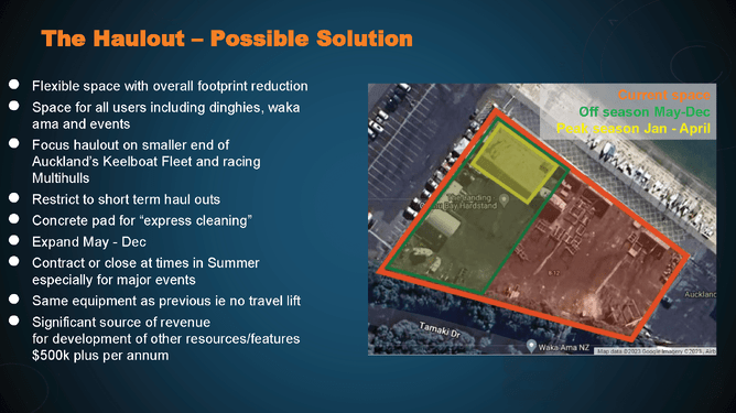 i) subject to commercial viability, retain approximately 50 per cent of the 2022 managed hardstand area (about 2,750 square metres, including the washdown pad and associated existing filtration system) to establish a smaller, flexible-use site for a short-stay haul-out facility to be used from May to December each year and the site being cleared and available for activations and major events from January to April, contingent on the approved operator providing the necessary infrastructure and a commensurate commercial return to the Ōrākei Local Board and operating to the highest industry standards in respect of water and air quality management