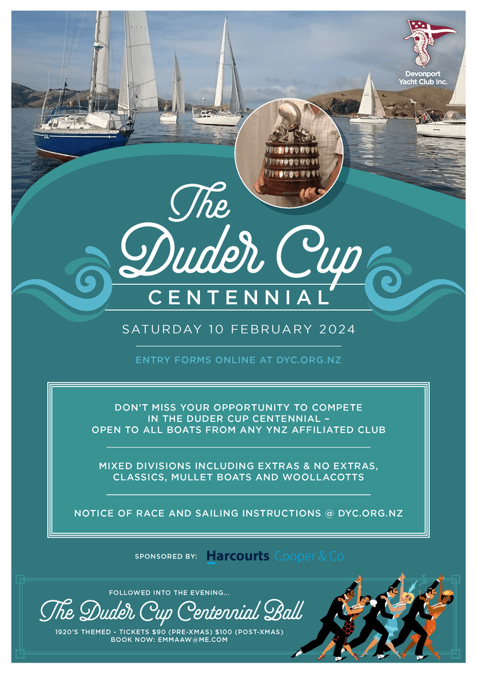 The Devonport Yacht Club are celebrating the 100th year of the Duder on Saturday 10th February 2024. All YNZ affiliated club members are invited to take part in this historic race and, consider attending the anniversary ball at the DYC on the evening of the 10th February.