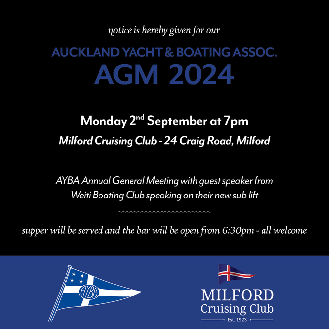 Auckland Yacht & Boating Association AGM 2024. Held on Monday 2nd September 2023 at 7pm at Milford Cruising Club.