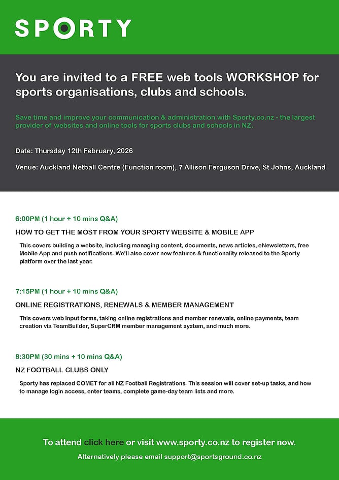 Save time and improve your communication & administration with Sporty.co.nz - the largest provider of websites and online tools for sports clubs and schools in NZ.