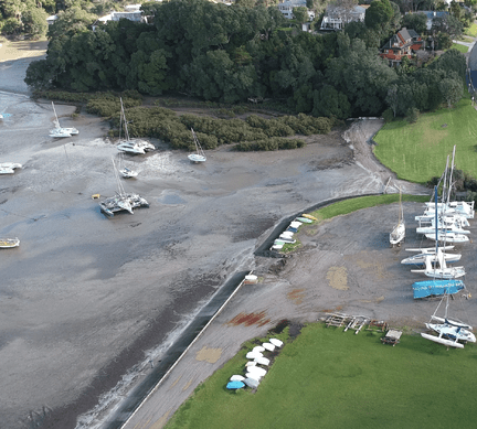 The Foreshore as a Community Asset: Two hours after high tide the water had already receded a hundred meters out of the Bay leaving the bare mud flats. It is not a beach for pleasant swimming but is a safe beach for younger children to splash along the shore line near high tide. The grass area and the playground enhance the area for families. The hard stand and boat yard is also an important family asset where boats can be serviced by the families.